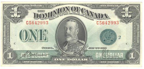 Dominion of Canada $1.00 note 1923 in nice Extra-Fine ++, DC-26j, McCavour Saunders, Green Seal, Group 2.