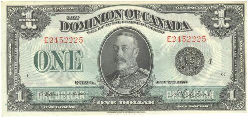 Dominion of Canada $1.00 note 1923 in Almost Uncirculated, DC-25o, Campbell Clark, Black Seak, Group 4, serial E2452225. Problem free note and great condition.