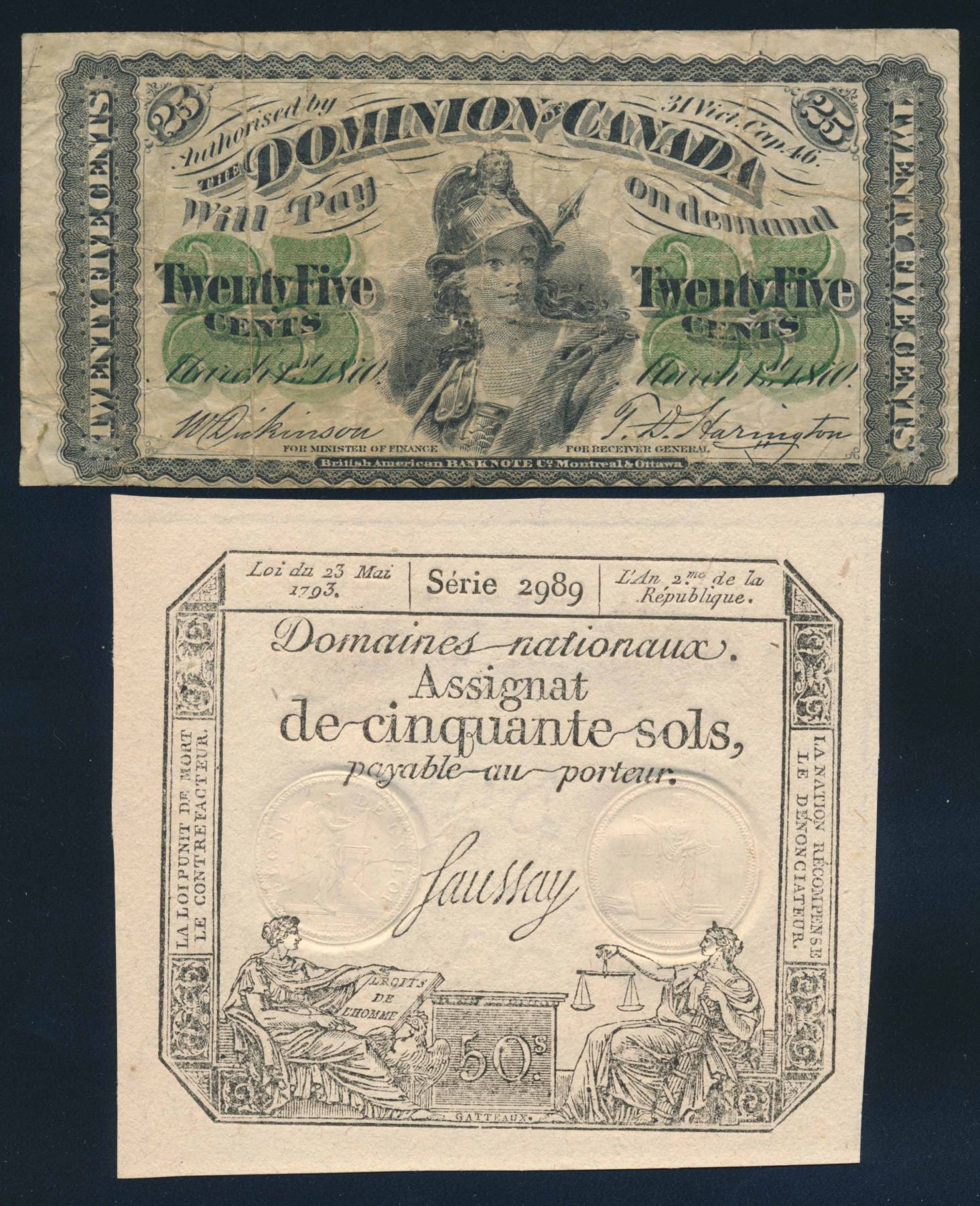 Dominion of Canada 1870 25c Shinplaster + France 1793 Assignat.Nice !