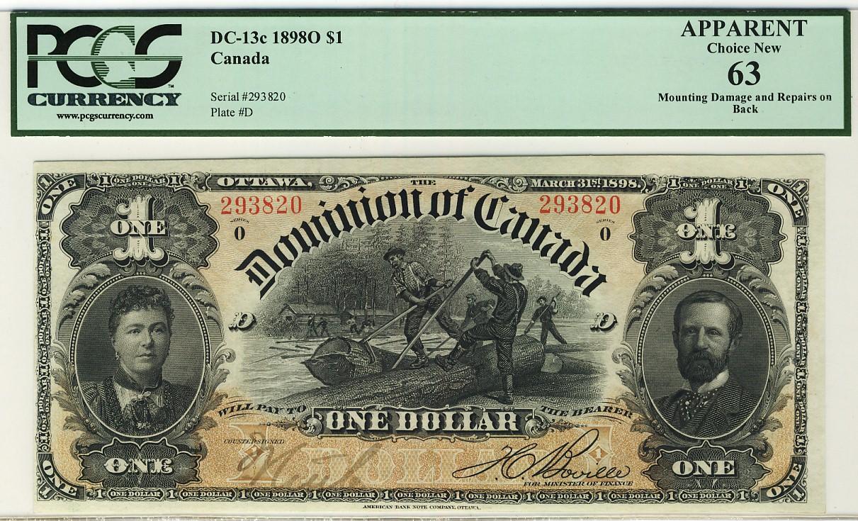 Dominion of Canada, 1898 $1 DC-13c #293820, PCGS UNC63. A choice Uncirculated with some very light problems on the back. Some mounting.