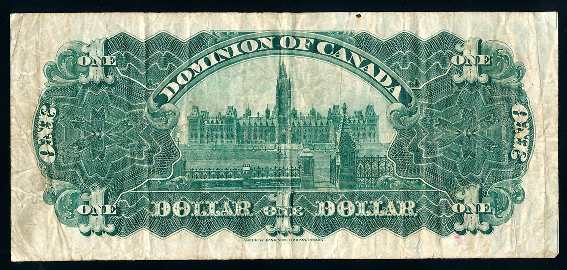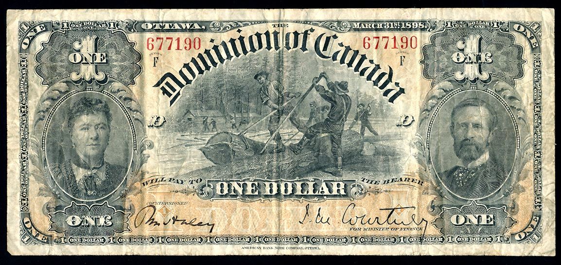 Dominion of Canada, One Dollar "Log drive on a Canadian river", 1898, Ch# : DC-13b, variety : Courtney One's curved outward. S/N : 677190. Catalogue $325 cdn