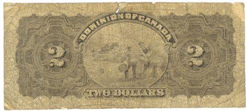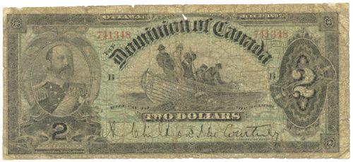 Dominion of Canada; $2.00 note 1897, DC-14b, Good. signature Courtney, serial 741348, letter B, Dark brown back.