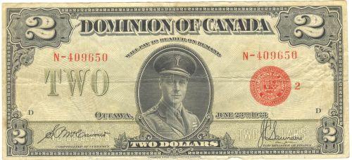 Dominion of Canada $2.00 note 1923 in Fine/Very Fine, DC-26g, McCavour Saunders, Red Seal, Group 2, serial N-409650.