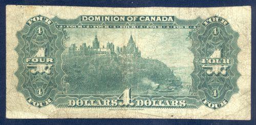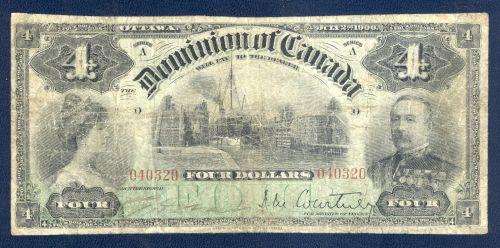 Dominion of Canada; $4.00 note 1900, DC-16, VG, series A, serial #A-040320, a very popular note , has a small 3mm tear in center crease.