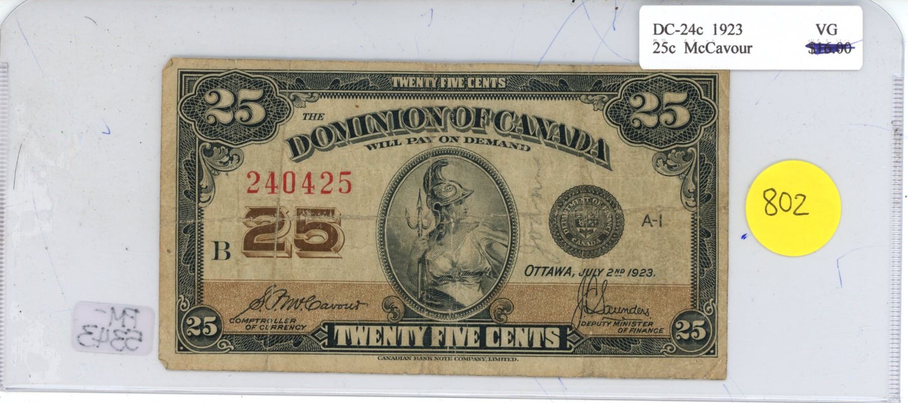 Dominion of Canada Dc-24c 1923 25c McCavour Pm-5343 Shinplaster