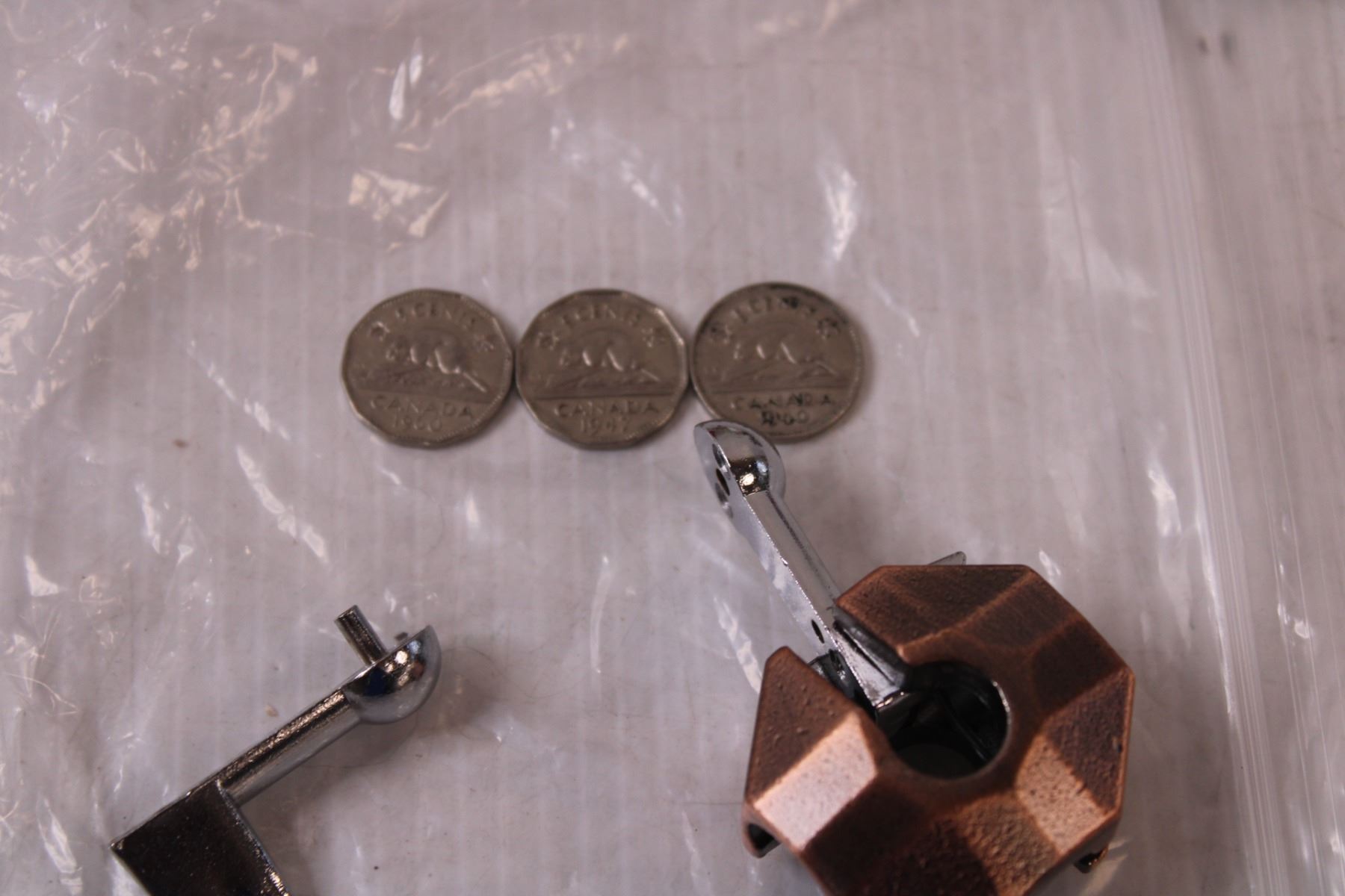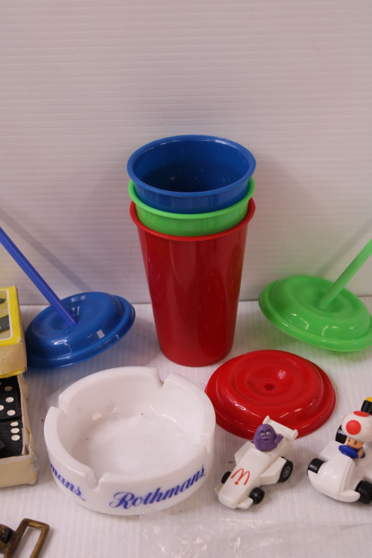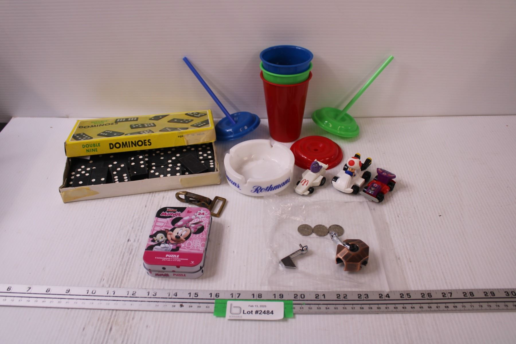Dominos, (3) Children's Plastic Cup Set, Minnie Mouse Puzzle - As Is, (3) Canadian Nickels (1970's), Mc Donalds Toys, Misc