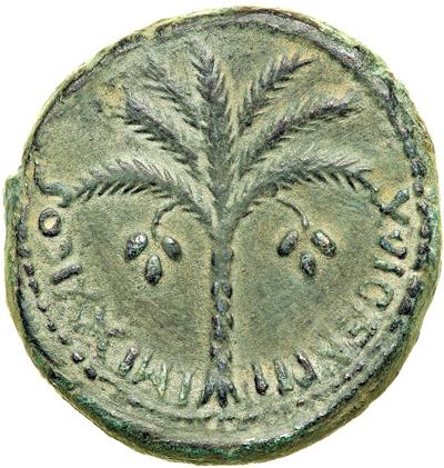 Domitian, 81-96 CE. AE 27 minted at Caesarea in 92 CE. Radiate head right of Domitian. Reverse: Palm tree with seven branches, two clusters of dates. AJC II, pl. 36, 9; H. 746. Nearly Extremely Fine.