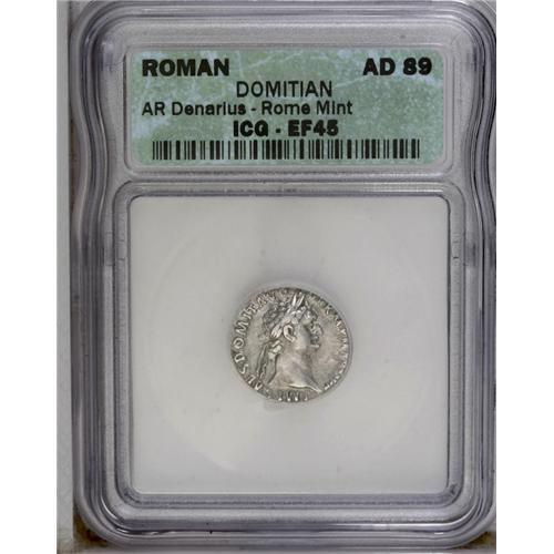 <B>Domitian.</B></I> A.D. 81-96. AR denarius (17 mm). Rome, A.D. 88-89. Laureate head right / Minerva standing left, holding thunderbolt and spear; shield at her side. RIC 139; BMC 153; RSC 251. XF45 ICG.