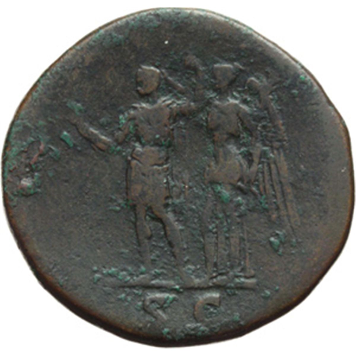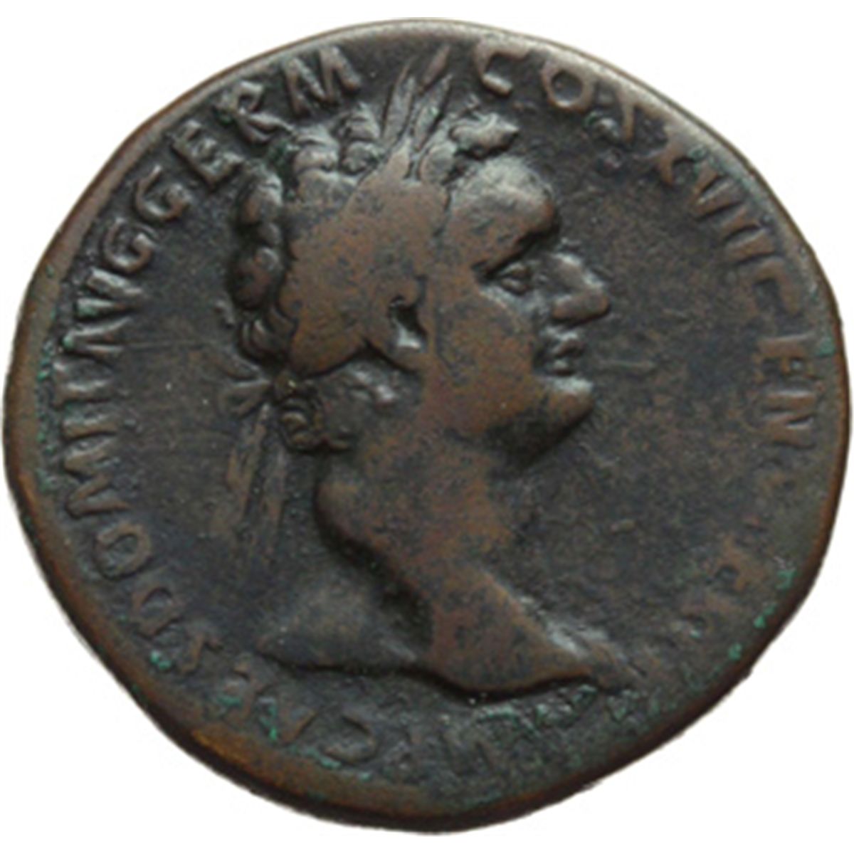 Impero Romano. Domiziano (81-96). Sesterzio. D/ IMP CAES DOMIT AVG GERM COS XVII CENS [PER PP]. Busto laureato a destra, con egida. R/ SC. Domiziano stante a sinistra con lancia e giavellotto. Dietro, la Vittoria stante lo incorona. RIC 415. AE. g. 28.19 mm. 34.00 BB/qBB.