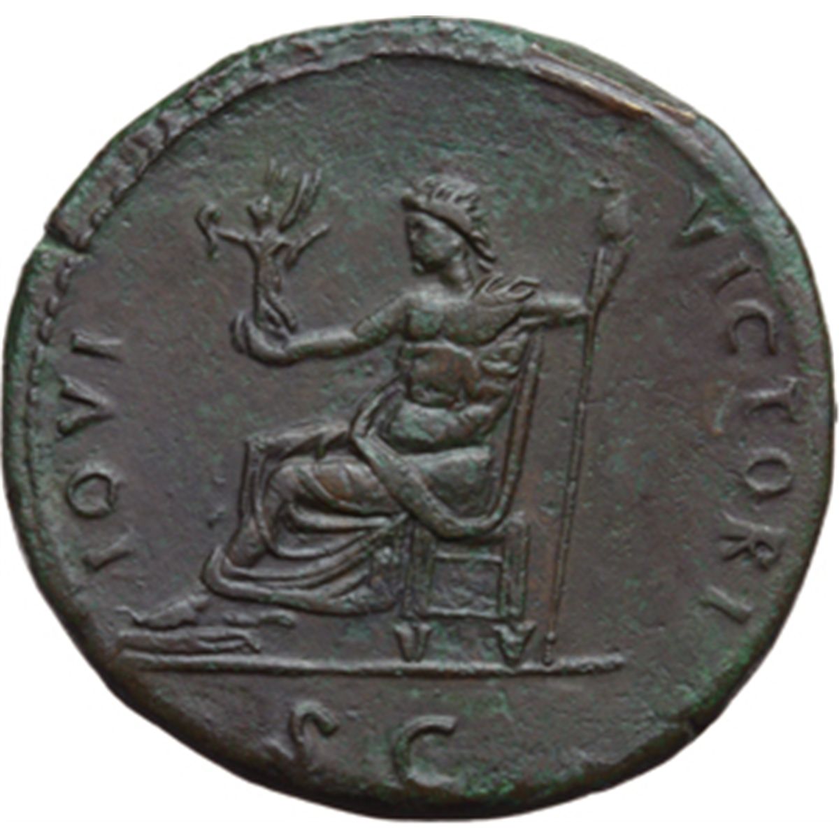 Impero Romano. Domiziano (81-96). Sesterzio. D/ IMP CAES DOMIT AVG GERM COS XVI CENS PERPP. Testa laureata a destra. R/ IOVI VICTORI SC. Jupiter seduto a sinistra tiene Vittoria e scettro. RIC 401. C. 315. AE. g. 21.77 mm. 33.00 SPL/qSPL. Esemplare molto attraente, con un ritratto di stile superbo.