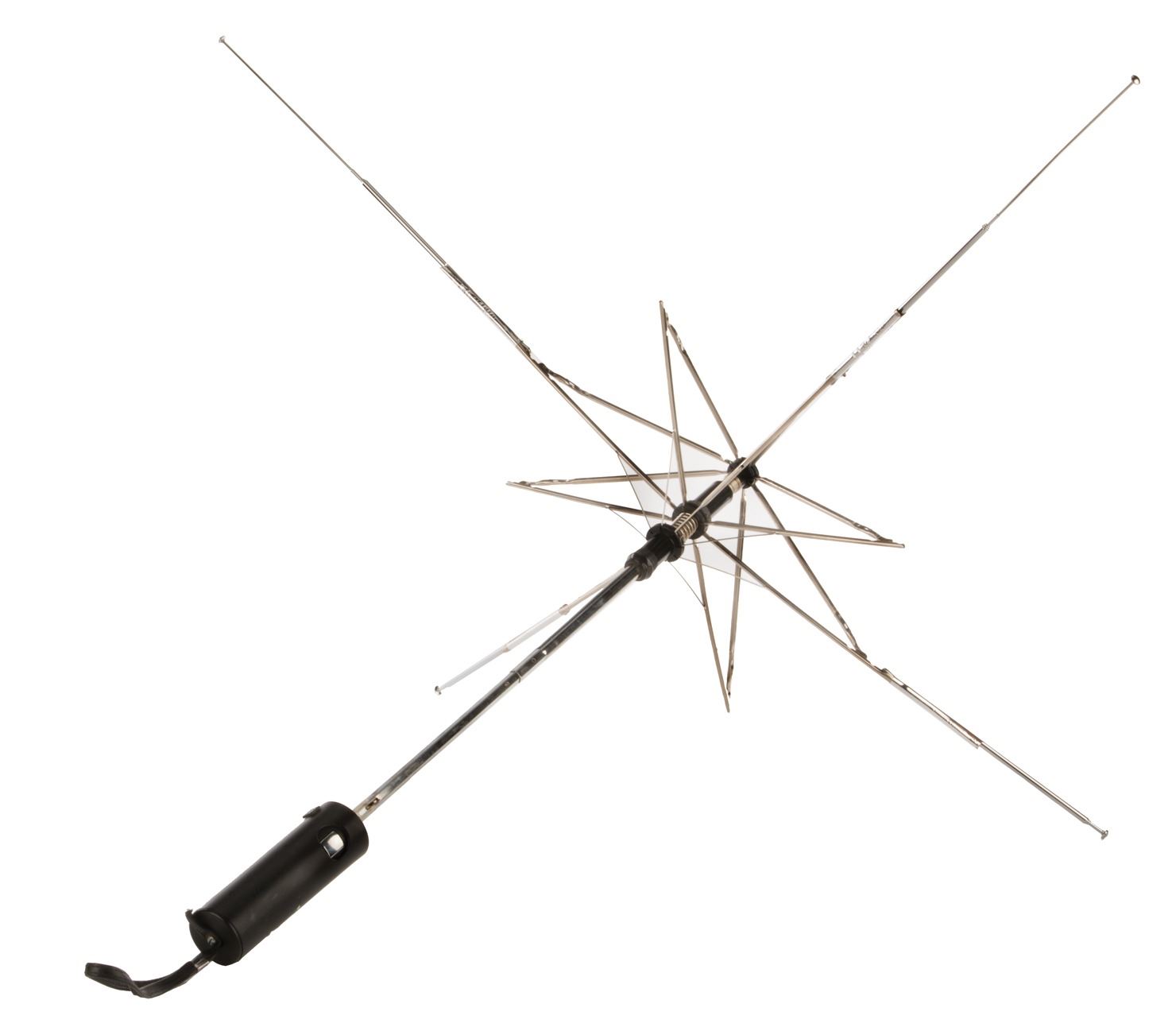 27. Don Adams "Maxwell Smart" SFX umbrella from Get Smart. (CBS, 1965-1970) Vintage original special FX prop umbrella. The faux high-tech spy gadgetry consists of a 19.5 in long compact umbrella, which when deployed, using the button on the handle grip, extends like a traditional umbrella without the fabric canopy. Instead, the bare metal stretcher spokes are made of telescoping antennae, giving the device a sort of space satellite appearance. Accompanied by the original umbrella fabric fabric sheath. Exhibiting minor age and production use. In vintage fine to very fine condition. Accompanied by a COA from Ellis Props. $3,000 - $5,000