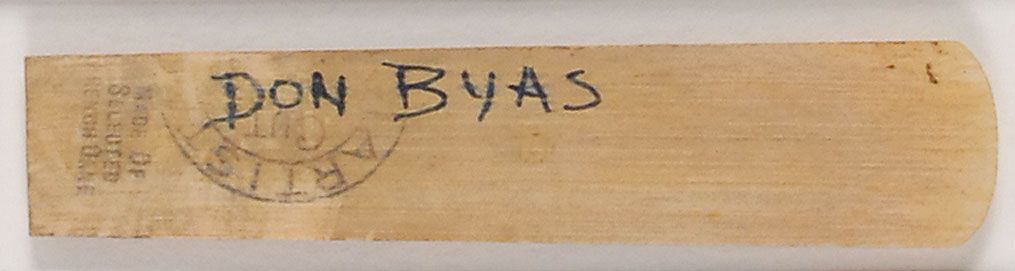 Tenor saxophonist associated with bebop (1912–1972). Vintage ‘Artist Cut’ saxophone reed, signed in black ink, “Don Byas.” Attractively mounted and matted with a close-up photo of Byas to an overall size of 13.25 x 18. In fine condition.