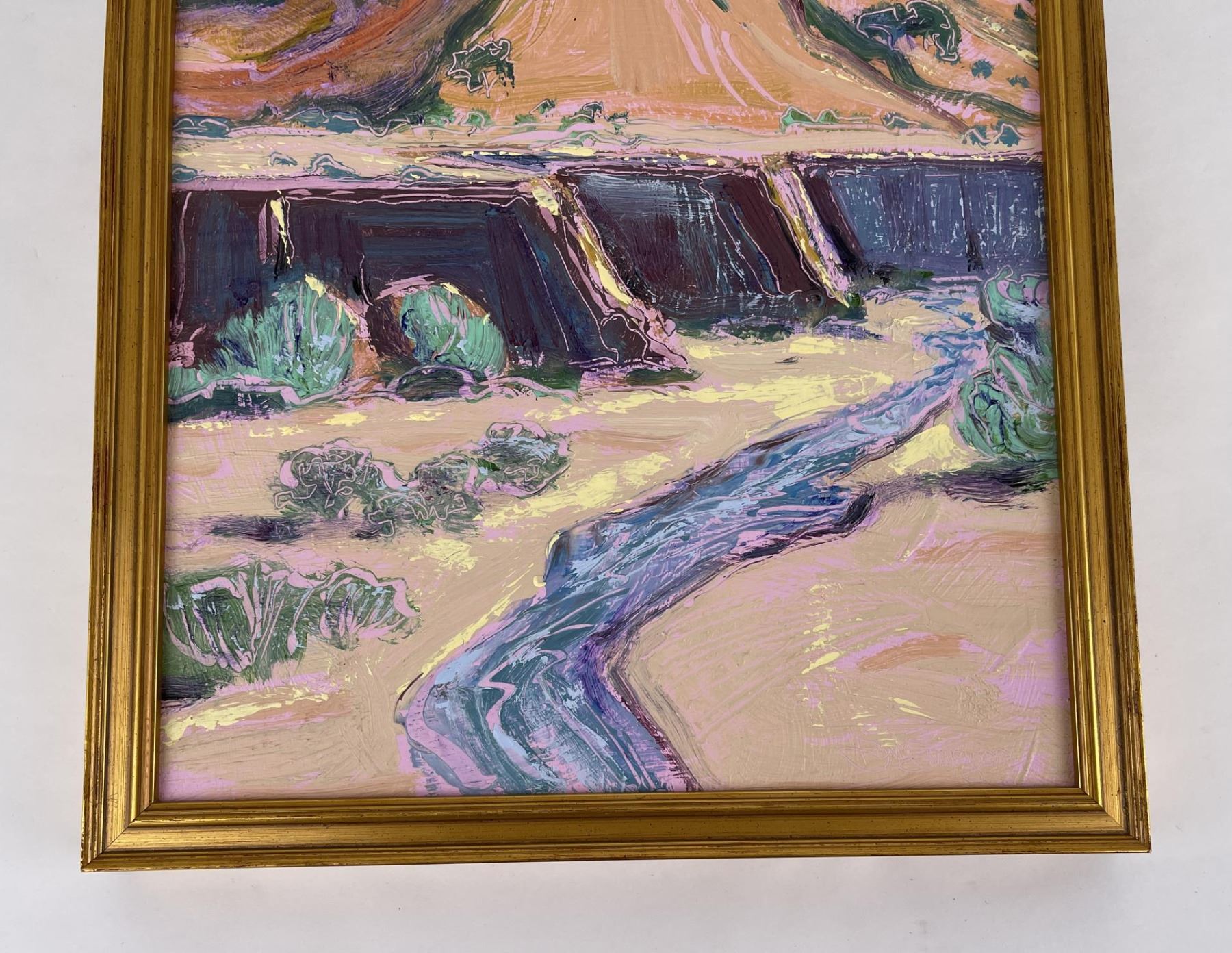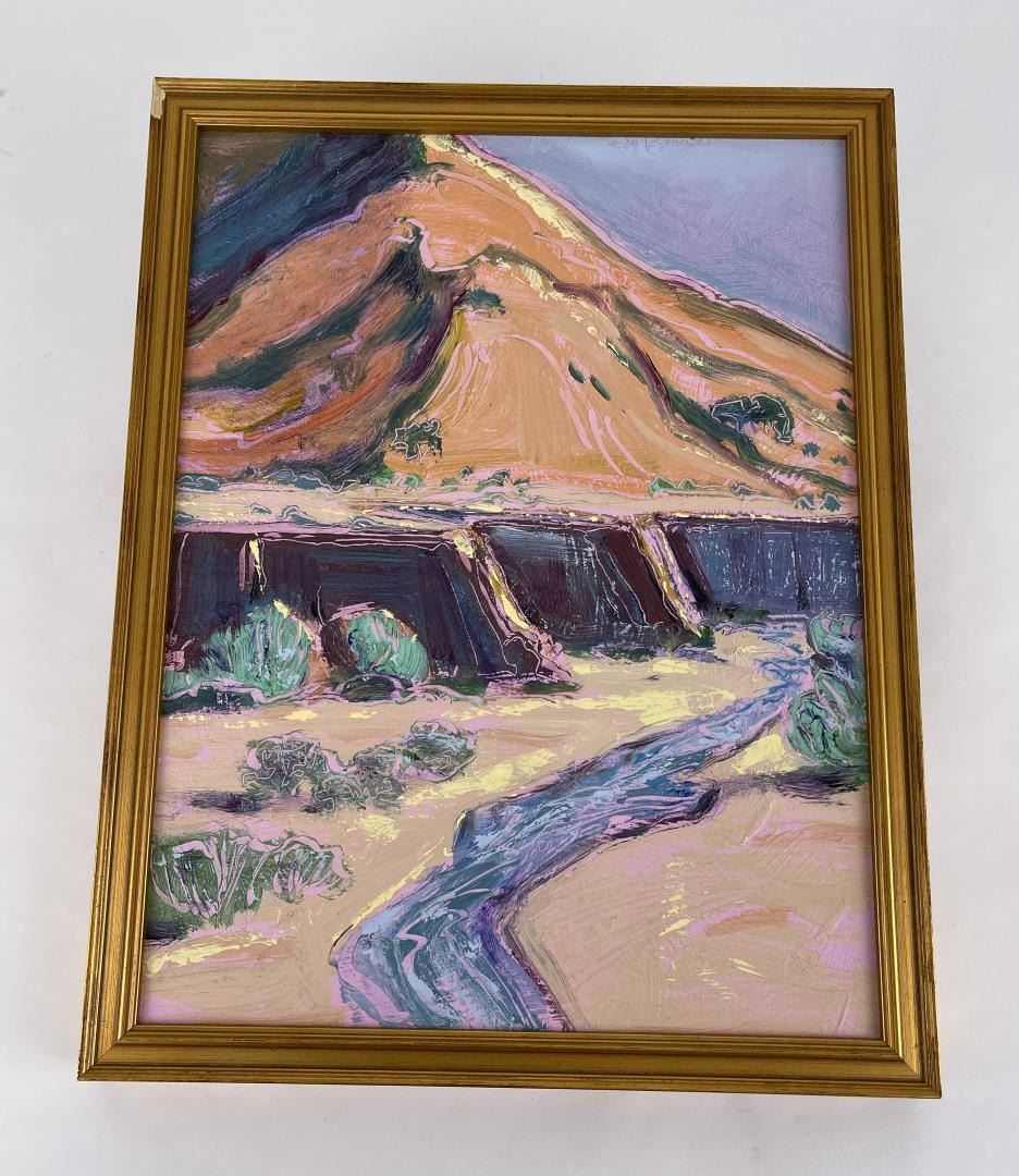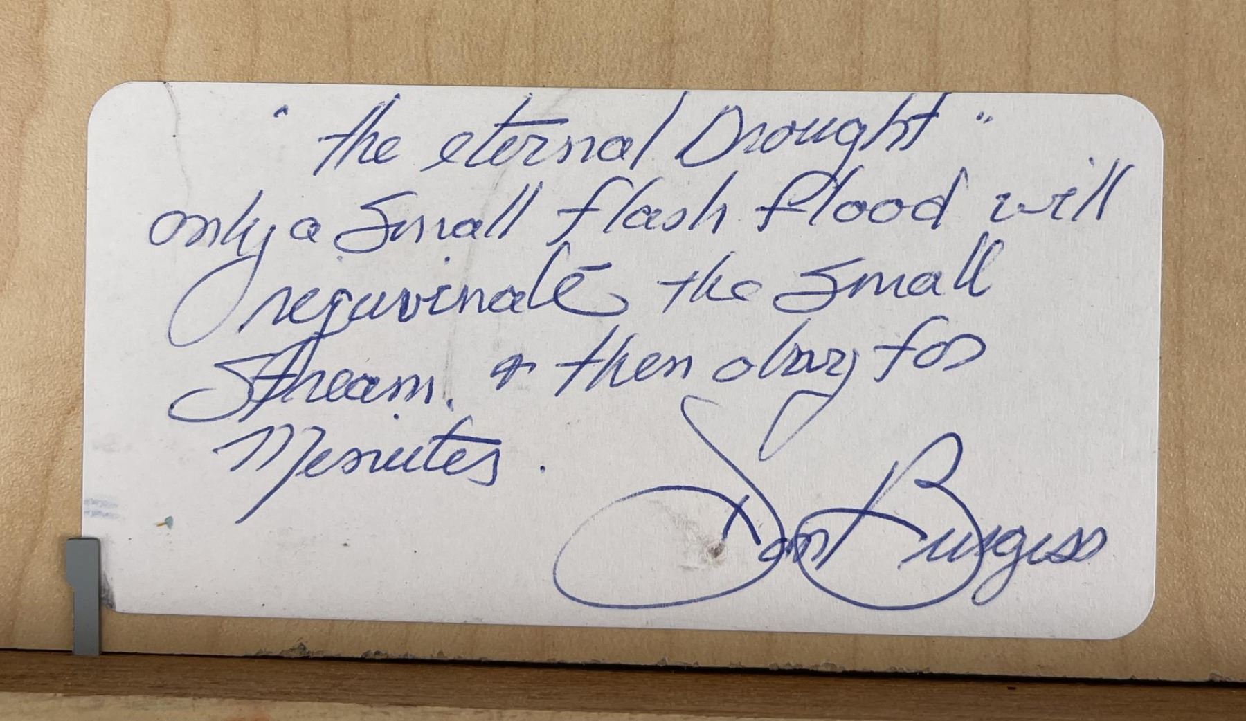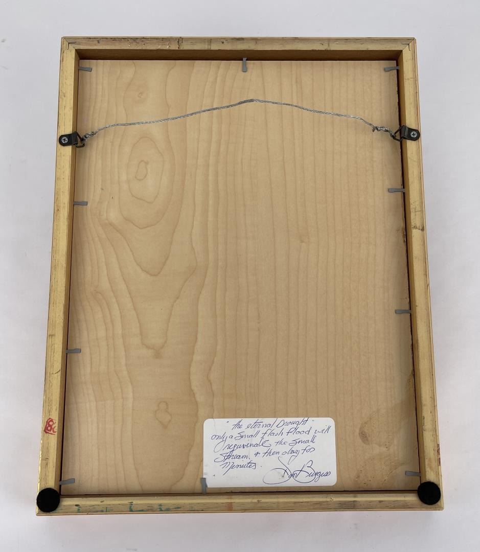 Title is "The Eternal Drought". 11.5" by 15" framed. Don Charlie Burgess, March 13, 1947 to January 3, 2018 Don Burgess was born in Hollywood, California in 1947. He had a fraternal twin brother, John Burgess and two half-brothers, Christian Title and Irwin Title. He grew-up in the San Fernando Valley, and attended Canoga Park High School before going on to Otis College of Art and Design. Don developed his painting skills while in college, and later studied under both Sergei Bongart and his older brother Christian Title. After college he backpacked and traveled throughout Europe visiting museums and painting. Some of his most significant stops and areas of inspiration were Amsterdam, Italy, and Switzerland and the Montmartre area in Paris. In his early years, he was inspired by Impressionism, which was a critical influence in developing his own stylistic landscapes. In addition to producing his artwork, in the late 1970’s and 1980’s Don owned a live music venue called the Blue Lagoon Saloon in Marina Del Rey, California. Numerous musicians had their start at his club including the Red Hot Chili Peppers, Johnny Depp (The Runaways), and Katey Sagal best known for her work in the television productions, "Married with Children" and "Sons of Anarchy. Etta James, sat-in on sets at the Blue Lagoon, and Jackson Browne, once sang at his birthday celebration. During the last twenty years of his life, Don was inspired by the rural landscape of Warner Springs, California as seen in his oil paintings, watercolors and drawings from this period. Don’s free time was spent painting in open fields and his art gallery. He shred his passion for art and painting by teaching art classes to children at local schools. Don passed away in Warner Springs on January 3, 2018.