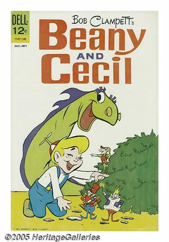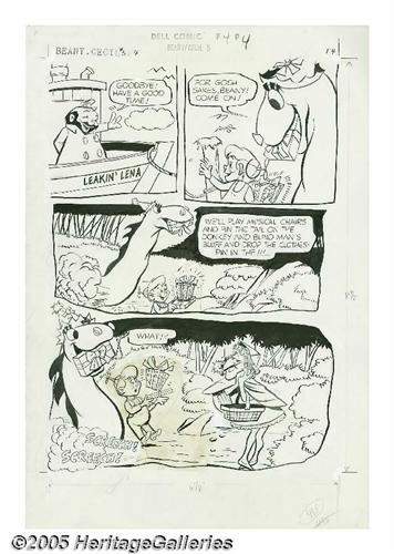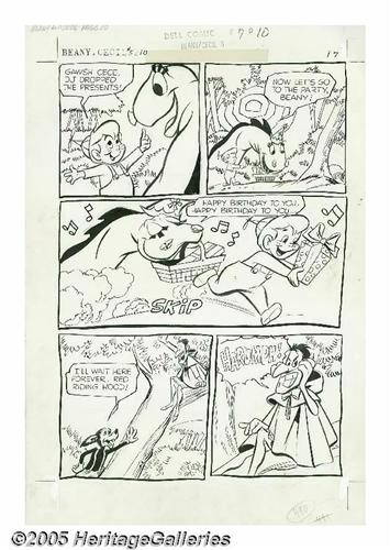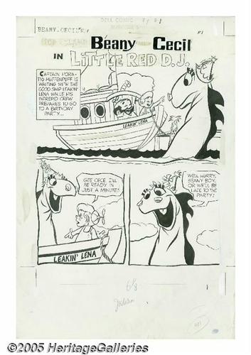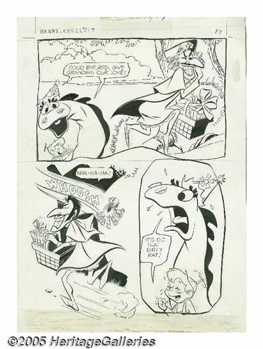 <B>Don Christensen (attributed) - Beany and Cecil #5 page Original Art, Group of 9 (Dell, 1963).</B></I> Only page five of this ten-page laugh-riot is missing from this lot, titled "Little Red D.J." D.J. tried to hijack Beany and Cecil's birthday presents disguised as Little Red Riding Hood and ended up being treed by the Big, Bad Wolf for his efforts. The image area each page measures 12" x 16". The art has numerous pasted-on art corrections; otherwise the art is in Very Good condition. Two copies of the comic book are included in this lot.