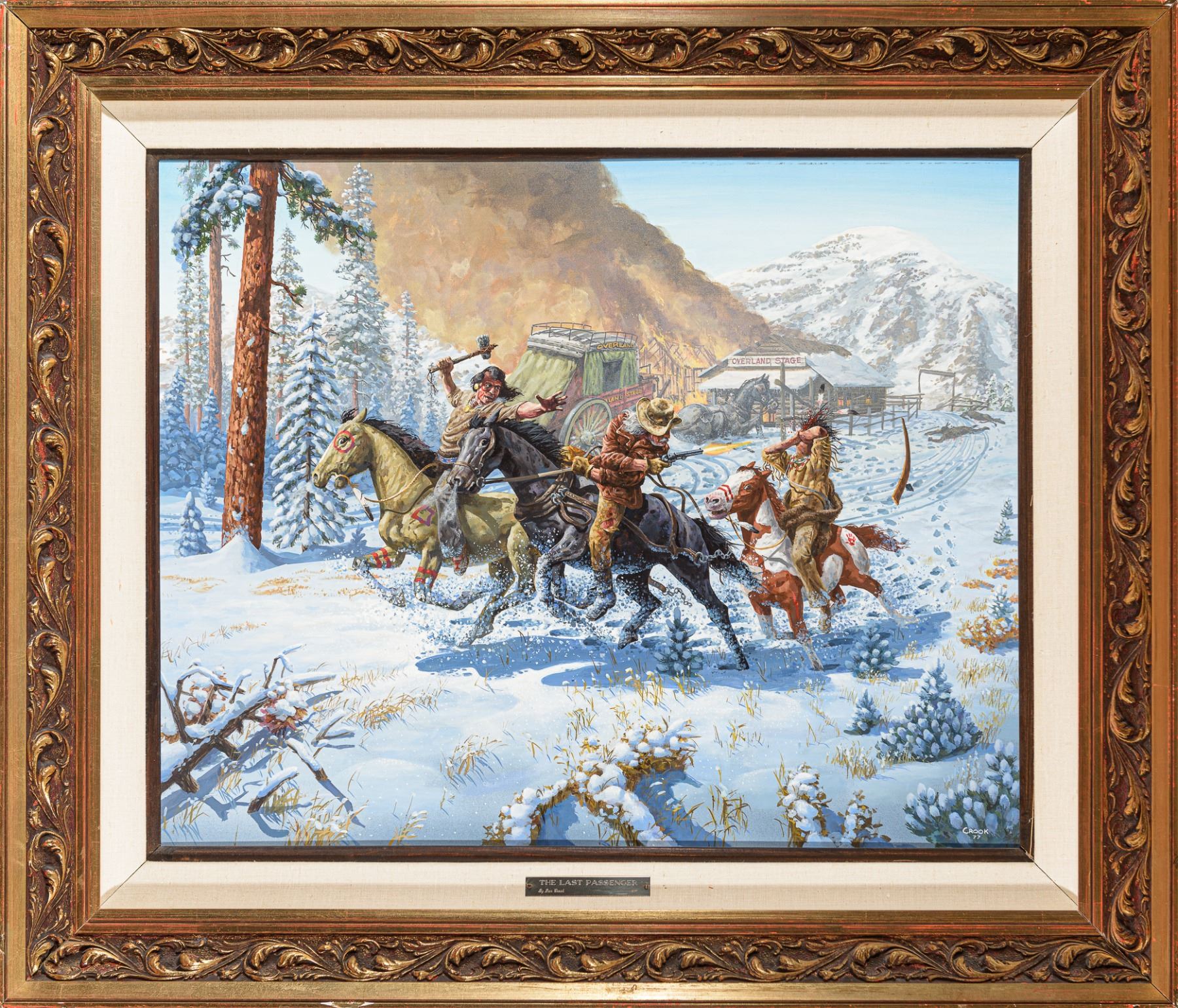 Condition details: This painting is in very good condition. Close inspection under UV light reveals nothing of issue and no signs of restoration. Inspection with the unaided eye does reveal marks along the upper edge where the panel has shifted in the frame. The work is framed in an ornate gold molding with a linen liner and a dark brown inner liner. The frame is in good condition with normal wear. Nameplate: The Last Passenger by Don Crook 1977.