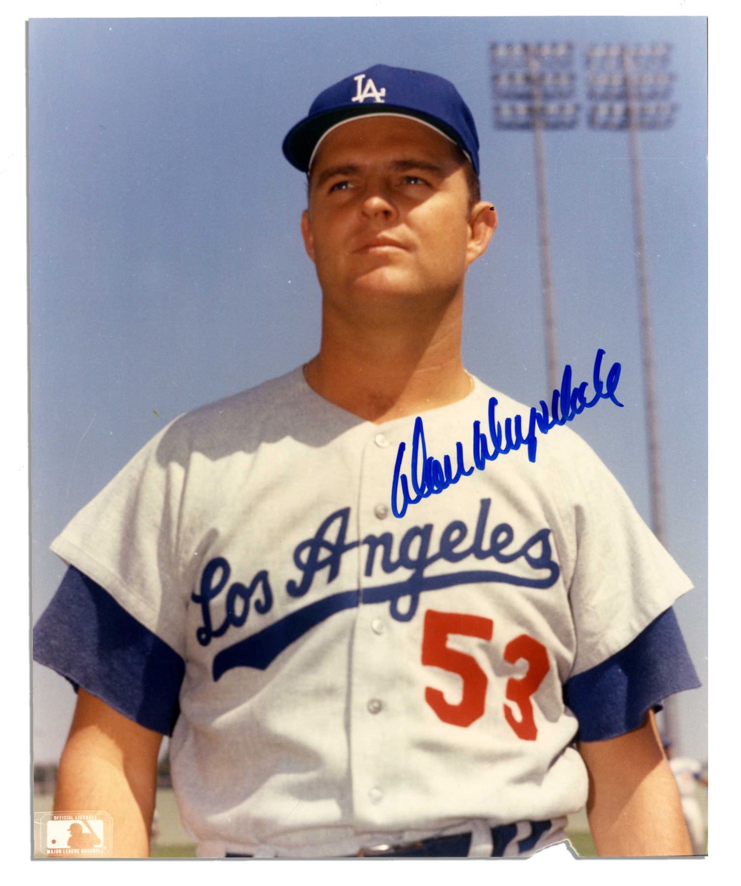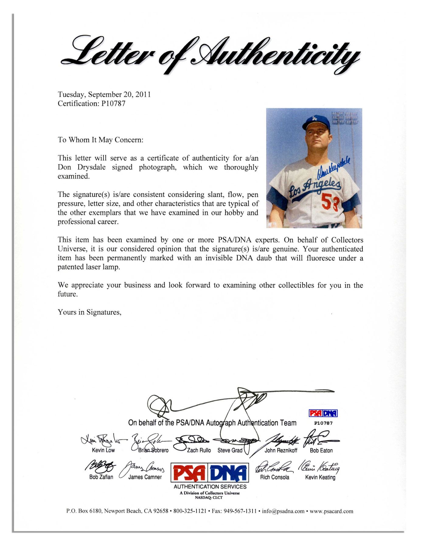 Don Drysdale photo signed. Color portrait of Drysdale in uniform as an L.A. Dodger is signed ''Don Drysdale'' in blue felt tip. Glossy photo measures 8'' x 10''. Near fine. With PSA/DNA COA.