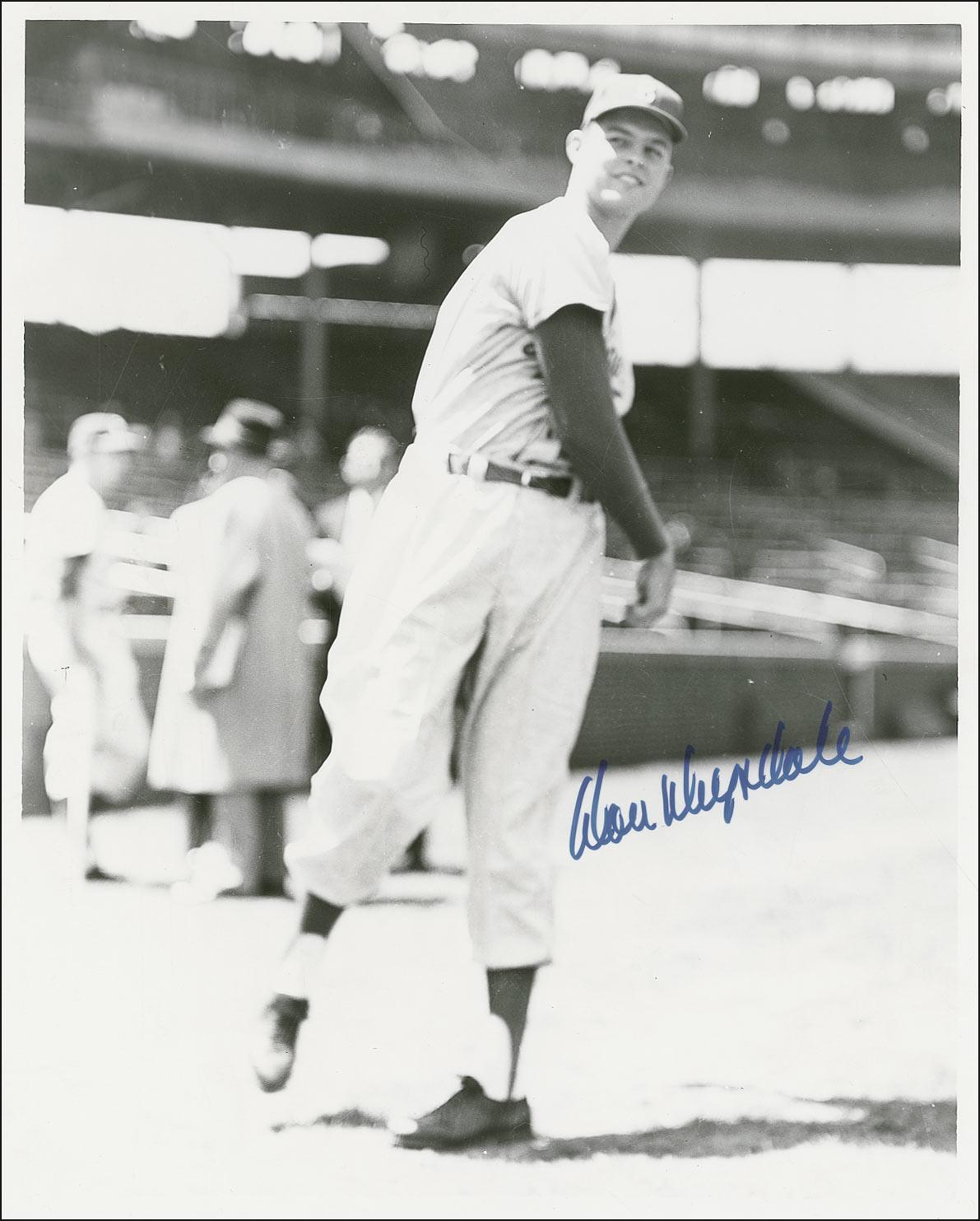 Glossy 8 x 10 photo of a youthful Drysdale in uniform, signed in blue felt tip “Don Drysdale.” In fine condition, with a few tiny surface impressions and the image slightly out of focus.