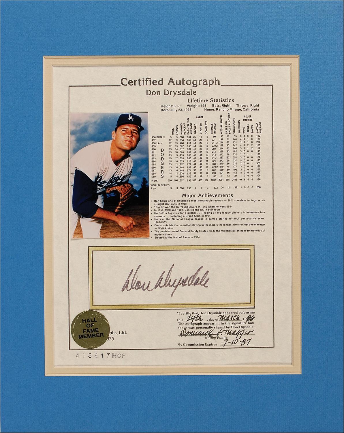 Notarized lifetime statistic sheet, 8 x 10, with an attached 2.5 x 4 color photo, signed in black felt tip in a prepared blank area near the bottom of the sheet. Double matted to an overall size of 11 x 14. In fine condition.