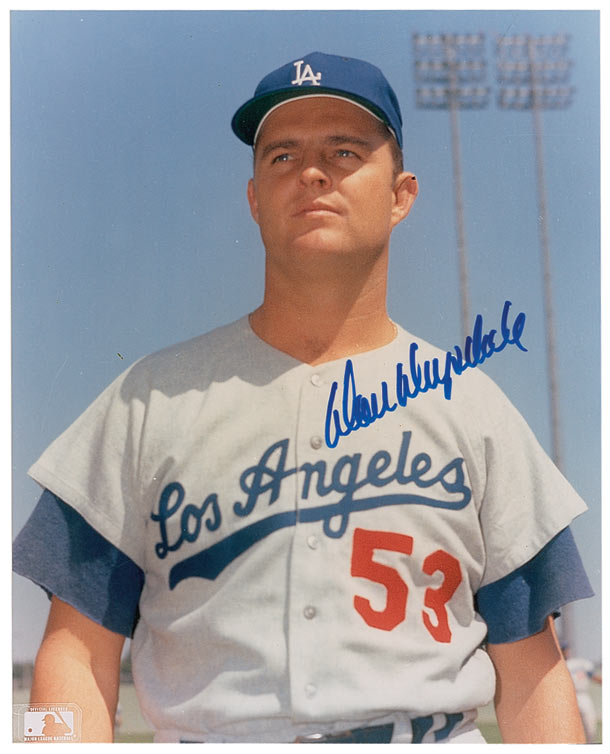 Color glossy 8 x 10 photo of Drysdale in uniform, signed in blue felt tip, “Don Drysdale.” In fine condition.