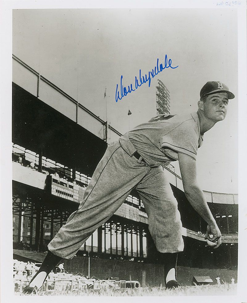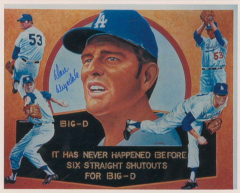 Two signed photos: a glossy 8 x 10 of Drysdale in his Brooklyn uniform, signed in blue felt tip; and a color 10 x 8 photo of a composite print honoring Drysdale’s shutout streak, also signed in blue felt tip. In fine condition.