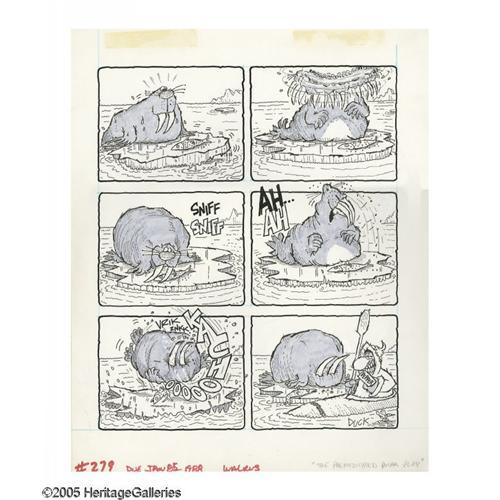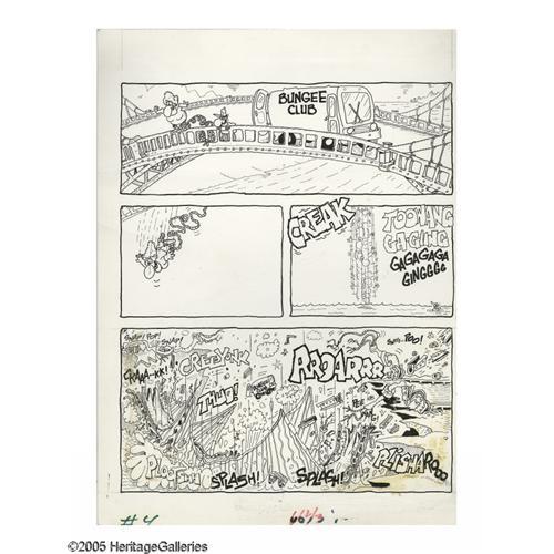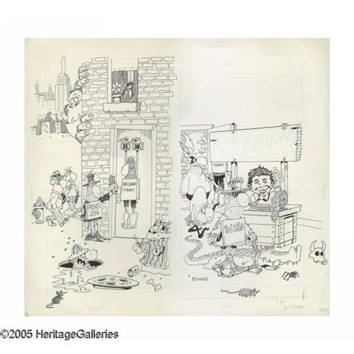 <B>Don "Duck" Edwing - Cover, Page, and Rough Sketch Original Art, Group of 13 (EC, 1980-92).</B></I> The <B>Mad</B></I>-cap art of Don "Duck" Edwing is featured in this gut-busting group lot. Included in this jam-packed lot are: The front and back cover art for <B>Mad Bizarre Bazaar</B></I> (with a combined image area of 19" x 16"), "The Premeditated Polar Ploy" page from <B>Mad</B></I> #279 (with an image area of 11" x 13.5"), "The Bouncing Bungee Blooper" page from <B>Mad</B></I> #313 (with an image area of 11" x 13"), eight pages from various <B>Mad</B></I> paperbacks (five have an image area of 5" x 9.5", while three from the "Great Research Disaster" have a "double-page" image area of 11.5" x 9"), and finally, one gag sketch, drawn on lined notebook paper (with an image area of 7" x 10"). All of these side-splitting <B>Mad</B></I>-sterworks are in Excellent condition.