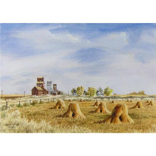 [Canadian 1919-1994] UNTITLED (STOOKS AND GRAIN ELEVATORS); 1969 Watercolour on paper 20.5 x 29.25 in. Signed & dated.
