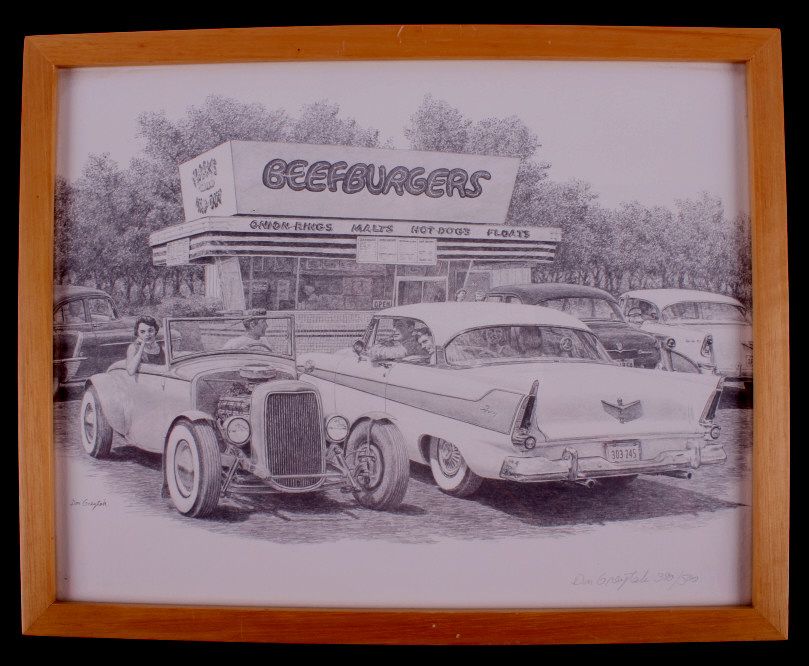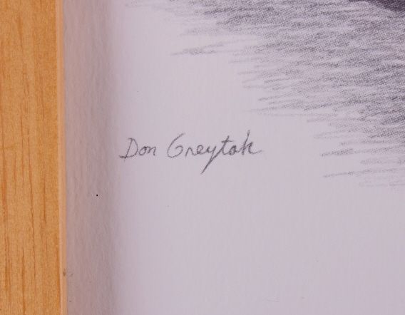 This is a limited edition framed print by Don Greytak. Greytak is a native Montanan, born and raised in Havre Montana. He began a career in art in the mid '70's. He is well known for his pencil sketches. In 2012, Greytak was inducted into the Montana Cowboy Hall of Fame. This print depicts a drive-in located in Livingston Montana during the '50's. It is signed and numbered 390/500. Original pieces by Don Greytak have sold for upwards of $2000-$3000. The print and frame are in very good condition. the frame measures 11.75" x 14.75".