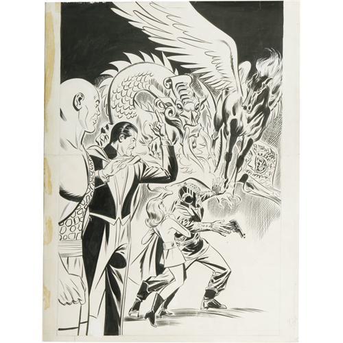 <B>Don Heck - Mandrake the Magician #1 Cover Original Art (King Comics, 1966). </B></I> Magic is in the air as "Mandrake's hypnotic magic fights the weird devices of the Toymaker" on the cover of the premiere issue of the sixties King Comics run. Don Heck, fresh from his artistic triumphs at Marvel Comics, brings his distinctive, crisp inking style to Lee Falk's legendary character and Mandrake has seldom looked more dashing. Mighty Lothar co-stars. This cover has an image area of 15" x 22". The art was folded horizontally through its center and there are some glue stains along the left border (outside the image area); otherwise, this Silver Age spectacular is in Very Good condition.<BR><BR><b>Shipping:</b> Flat Material, Large (<a target="_blank" href="http://www.heritageauctions.com/common/shipping.php">view shipping information</a>)