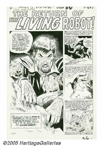<B>Don Heck - Tales of Suspense #9, Complete 5-page Story "The Return of the Living Robot" Original Art (Marvel, 1960).</B></I> Don Heck's art has seldom looked finer than for his work for this dramatic thriller from pre-hero Marvel. "The Return of the Living Robot" featured the plot twists that made these '60s tales so much fun. The image area of the art measures 12.5" x 18.5", and aside from a "continued" stat taped to a panel at the bottom of page four, the art is in Excellent condition. Excelsior! Dashin' Don Heck fans will want to bid heartily on this lot!