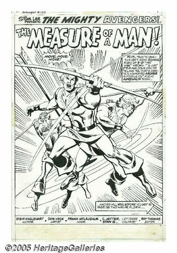 <B>Don Heck and Frank McLaughlin - The Avengers #109, Splash Page 1 Original Art (Marvel, 1973).</B></I> A certain Hawkeyed Archer pours out mucho adrenalin in this splash page to the story, "The Measure of a Man!," written by Steve Englehart. Penciler Don Heck and inker Frank McLaughlin give us a multi-view of Hawkeye in action. The image area measures 10" x 15", and the art includes the original masthead. There is some tape residue staining at three edges, and glue stain residue along the bottom from the missing indicia paste-up, otherwise the art is in Excellent condition.