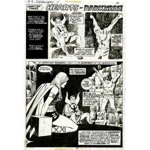 <B>Don Heck and Vince Colletta - Giant-Size Defenders #4 Page 31 Original Art (Marvel, 1975).</B></I> The Defenders awaken to find themselves shackled in a dungeon in the basement of an observatory, in this desperate scenario penciled by Don Heck, and inked by Vince Colletta. From "Too Cold a Night For Dying!," written by Steve Gerber, this page has an image area of 10" x 15". The edges were trimmed during the production process, and there is some light, scattered soiling; otherwise the work is in Very Good condition.