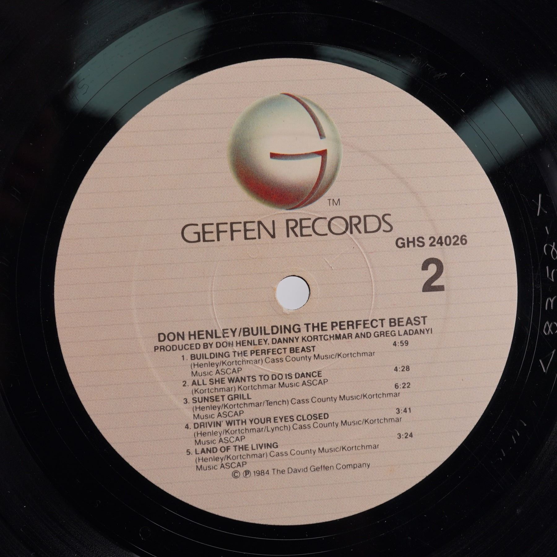 Don Henley - Building the Perfect Beast vinyl LP album, released in 1984 on Geffen Records (GHS 24026). This acclaimed solo release from the Eagles frontman features the Grammy-winning hit The Boys of Summer along with Sunset Grill, All She Wants to Do Is Dance, and the title track Building the Perfect Beast. Co-produced by Henley, Danny Kortchmar, and Greg Ladanyi, the album blends introspective songwriting with polished synth-rock production and was a defining work of 1980s adult-oriented rock. The record sports the original cream-colored Geffen label, and the jacket presents a moody portrait of Henley in rich shadow and sepia tones. Sleeve exhibits moderate creasing and shelf wear; vinyl in clean, playable condition.
