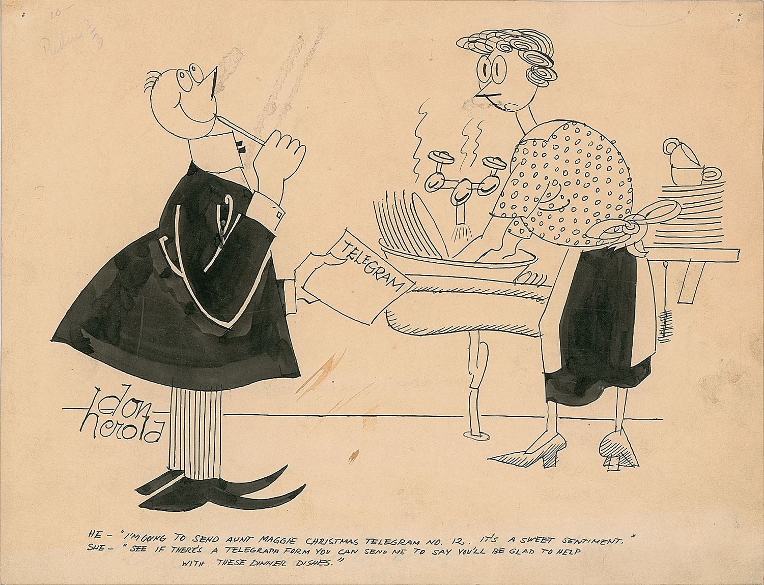 American humorist, writer, illustrator, and cartoonist (1889–1966) who wrote and illustrated many books and was a contributor to various national magazines. Wonderful original comic art by Don Herold, accomplished in graphite and ink on an off-white 13.5 x 10.25 sheet of artist’s cardstock, signed in the lower left by Harold. The single panel comic depicts a husband-and-wife kitchen scene, the man mulling over what to write on a telegram, the woman laboring over a stack of dirty dishes. Caption dialogue below reads: "HE—'I'm going to send Aunt Maggie Christmas telegram No. 12. It's a sweet sentiment.' SHE—'See if there's a telegram form you can send me to say you'll be glad to help with these dinner dishes.'" Reverse bears editorial notes in blue artist's pencil, "Wanted 9.30 am Monday, Tribune Syndicate." In fine condition, with light overall soiling and tack holes to corners.