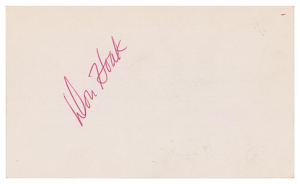 Baseball player (1928–1969) who played for five teams, including the Brooklyn Dodgers. He died of a heart attack while chasing after his brother-in-law’s stolen car. Red ballpoint signature, “Don Hoak,” on an off-white 5 x 3 card. In fine condition, with some mild edge toning.