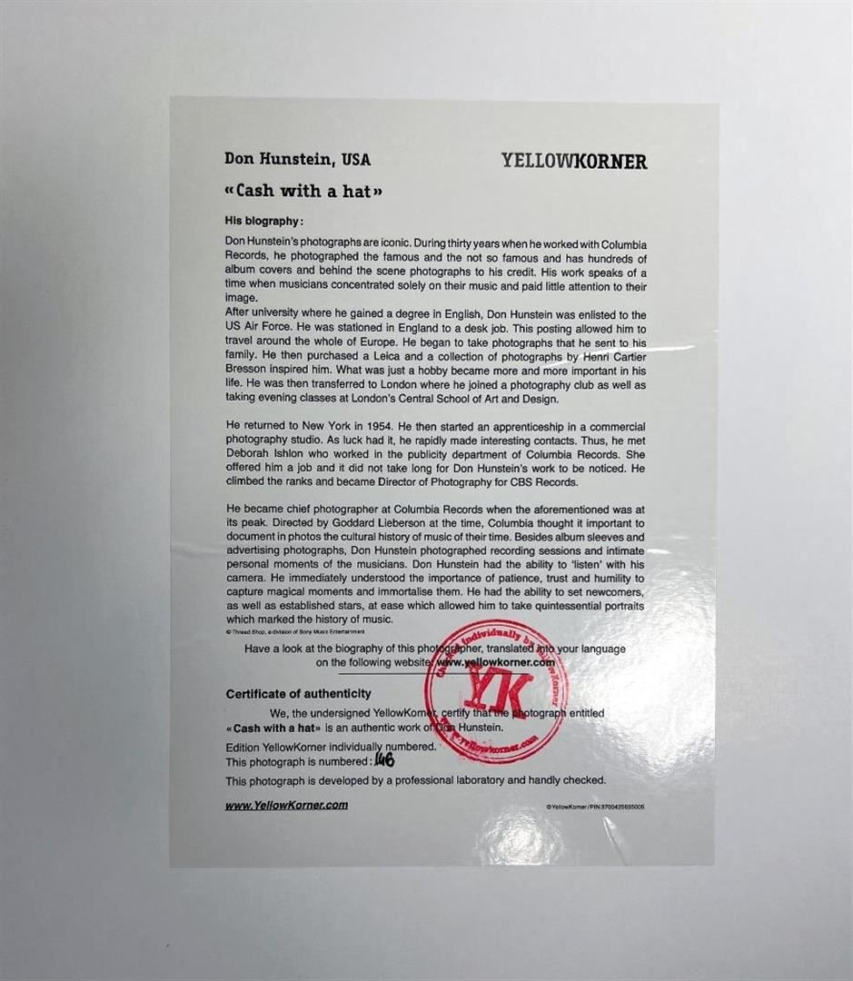 Don Hunstein USA Johnny Cash with a hat YellowKorner Certified Photograph. Certificate of Authenticity from YellowKorner affixed to the back. Matted Dimensions 16"x20". Protected with Clear Mylar Sleeve.