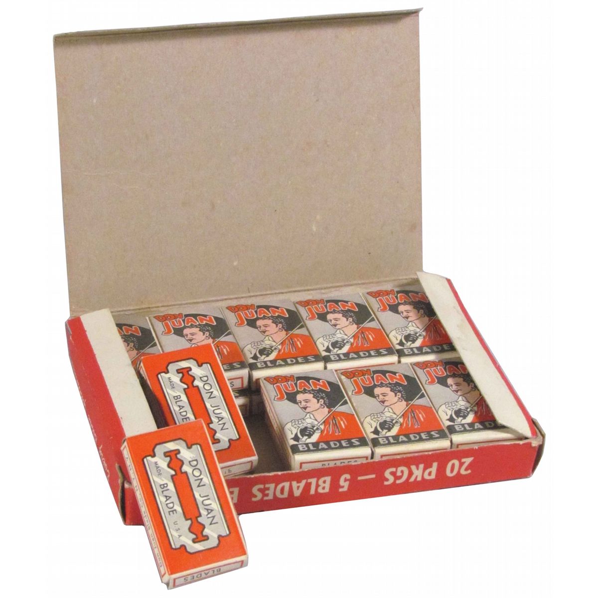 Don Juan Double Edge Cardboard Store Display with product. Excellent graphics. Excellent condition. 4 1/4 X 6 inches.