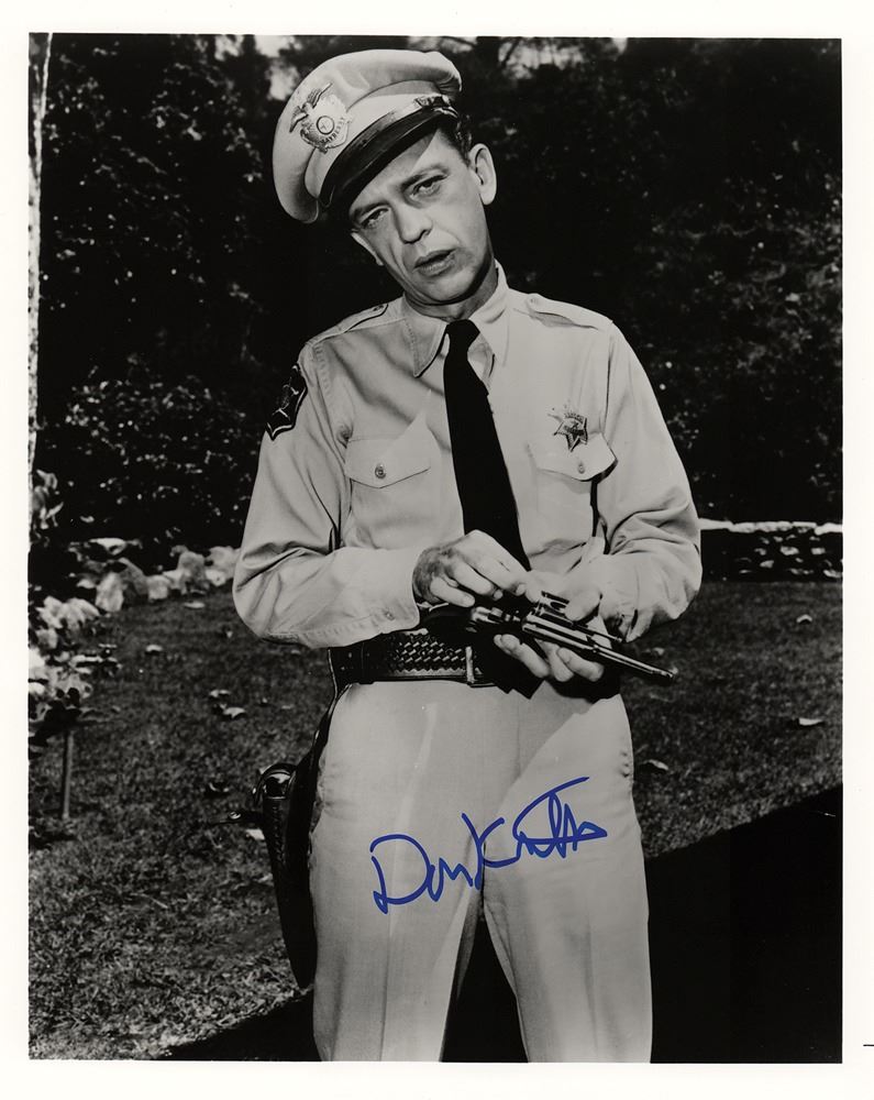 Glossy 8 x 10 photo of Don Knotts as Deputy Barney Fife in The Andy Griffith Show, signed in blue felt tip. In very fine condition. Originally obtained by in-person specialist Mike Wehrmann.