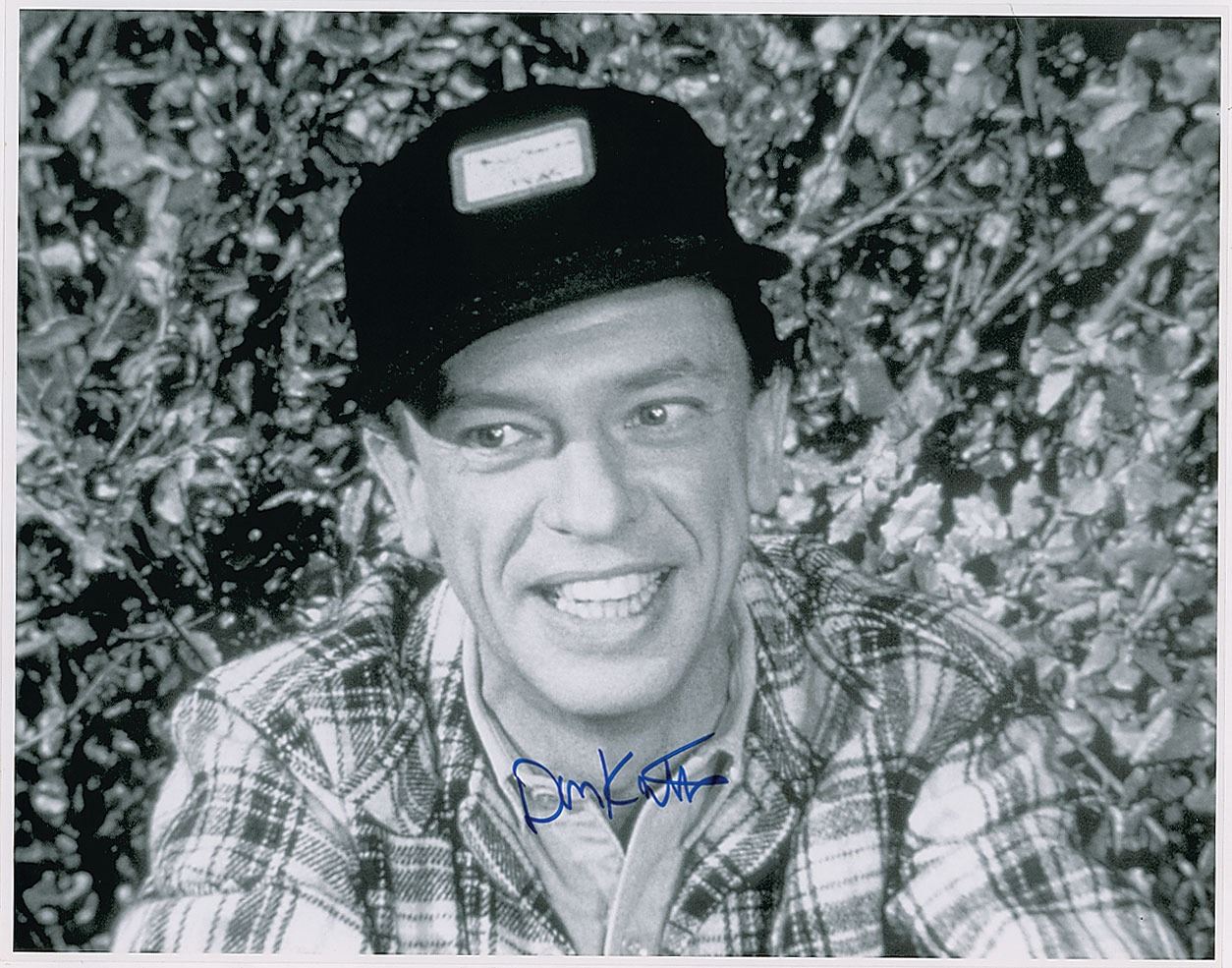 Two matte-finish photos of Don Knotts as Barney Fife on the Andy Griffith Show, 14 x 11 and 11 x 14, each signed in blue felt tip. In fine condition. Accompanied by images taken at the time of signing.
