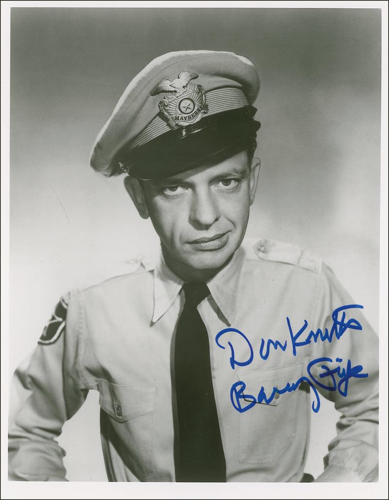 Glossy 8 x 10 photo of Barney Fife, signed in blue felt tip, “Don Knotts, Barney Fife.” In very fine condition.