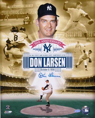 Don Larsen's most notable accomplishment was pitching the only perfect game (as well as the only no hitter) in the history of the World Series, and one of only 18 perfect games overall. He was pitching for the New York Yankees in Game 5 of the 1956 World Series against the Brooklyn Dodgers, on October 8, 1956. His perfect game remains the only no-hitter of any type ever pitched in postseason play. Don Larsen has hand signed this New York Yankees 11x14 Collage Photo commemorating his 1956 World Series Perfect Game & its 50th Anniversary. MLB Hologram and Certificate of Authenticity from Athlon Sports.