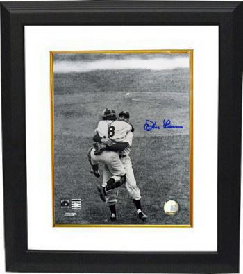 Don Larsen's most notable accomplishment was pitching the only perfect game (as well as the only no hitter) in the history of the World Series, and one of only 18 perfect games overall. He was pitching for the New York Yankees in Game 5 of the 1956 World Series against the Brooklyn Dodgers, on October 8, 1956. His perfect game remains the only no-hitter of any type ever pitched in postseason play. Don Larsen has hand signed this New York Yankees 8x10 Photo hugging Yogi Berra after 1956 World Series Perfect Game. Certificate of Authenticity from Athlon Sports Collectibles. Custom White Mat and Premium Black Color Framed as shown.