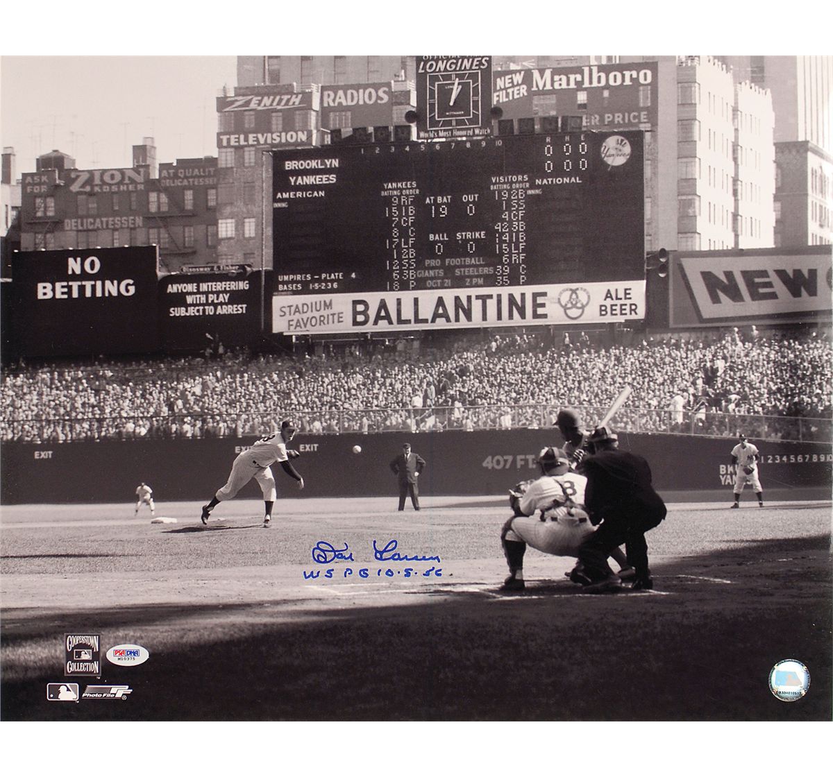 Glossy 20 x 16 photo of Larsen at the start of his famous perfect game, signed in blue felt tip, “Don Larsen, WS PG 10-5-56.” In fine condition, with a PSA/DNA label affixed to the lower left corner.