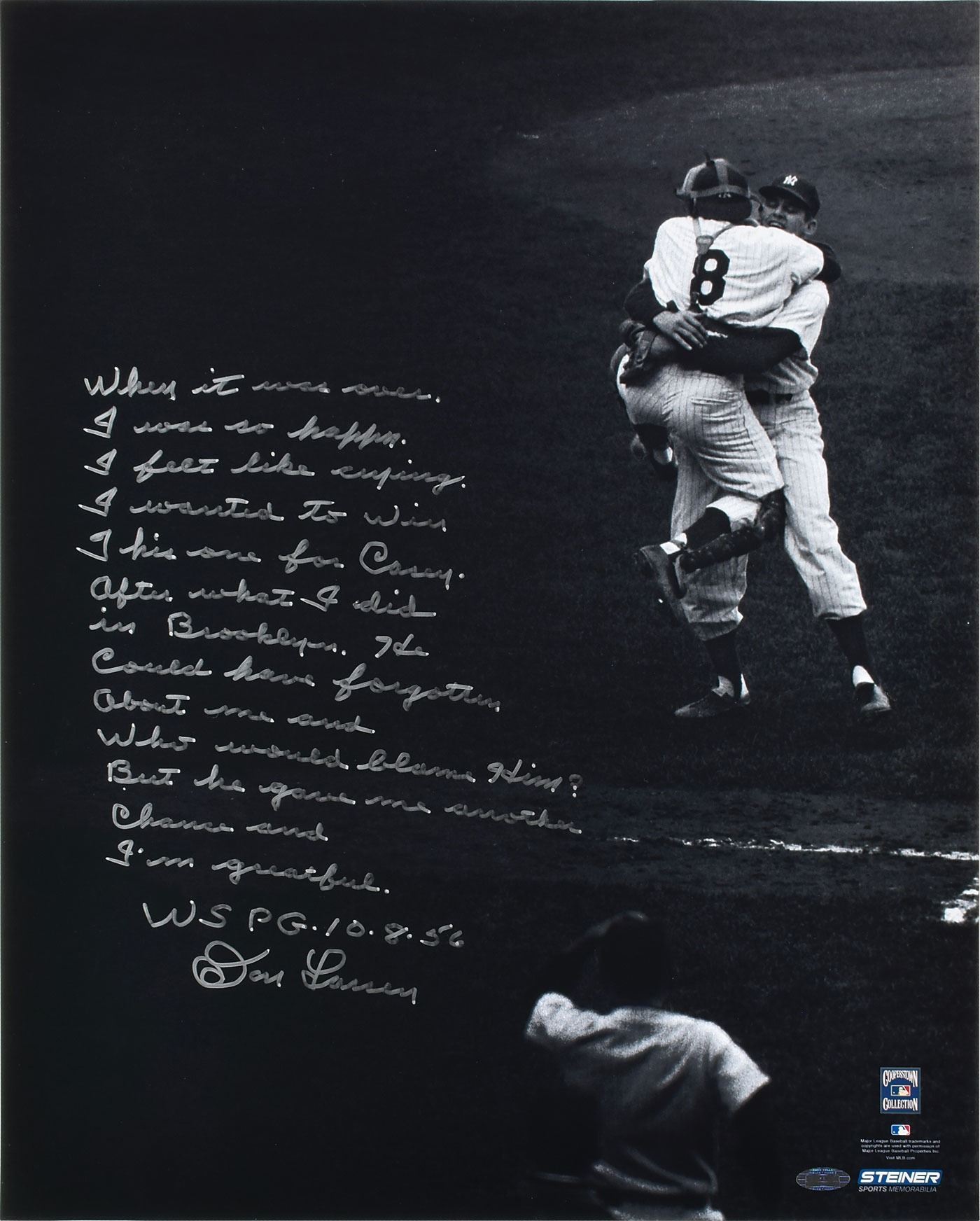 Satin-finish 16 x 20 photo of Larsen embracing catcher Yogi Berra after his 1956 World Series perfect game, signed in silver ink, "When it was over, I was so happy, I felt like crying, I wanted to win this one for Casy, after what I did in Brooklyn. He could have forgotten about me and who would blame him? But he gave me another chance and I'm grateful. WS PG 10-8-56." In fine condition. Accompanied by a certificate of authenticity from Steiner Sports.