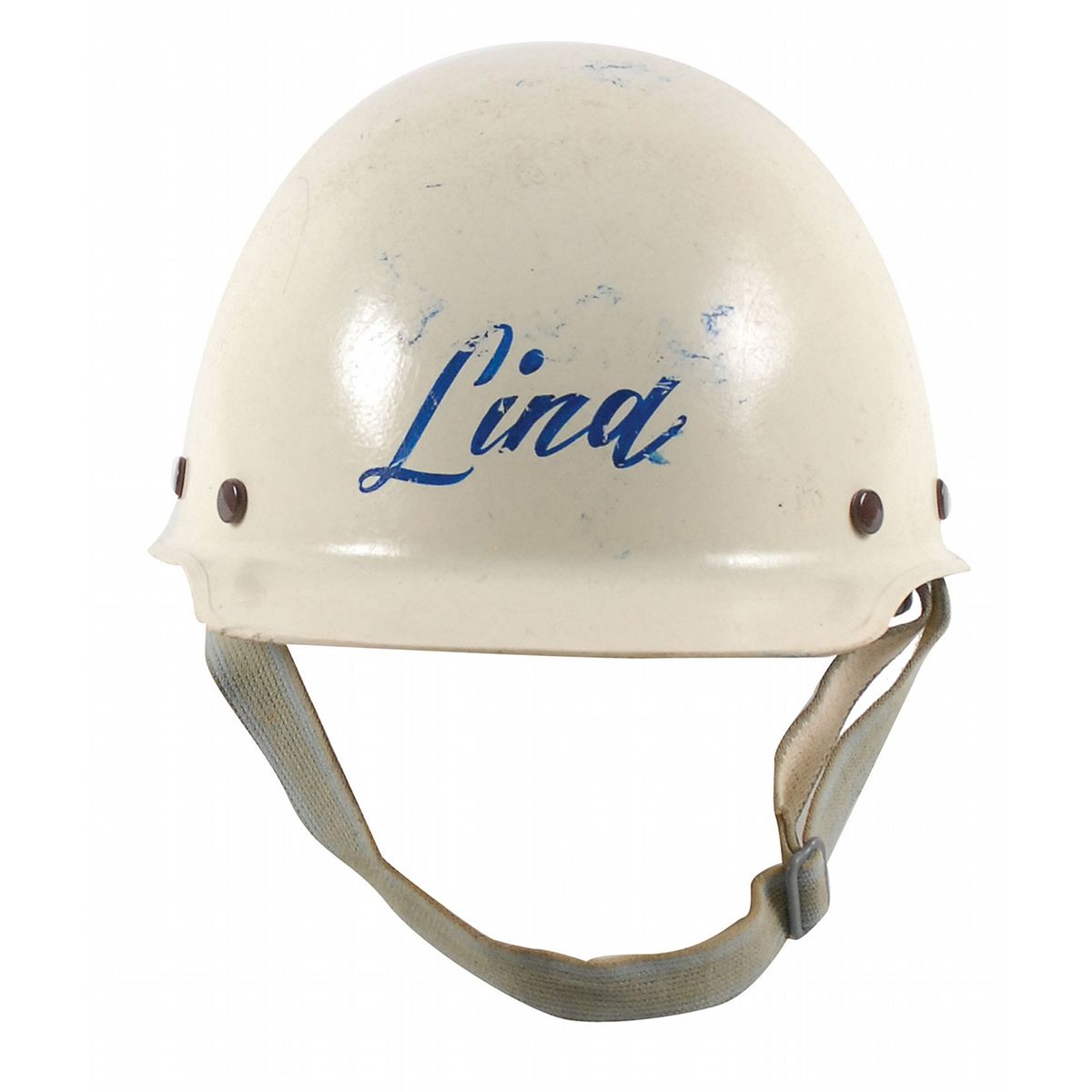 Off-white hard hat prepared for Lind for use at the Kennedy Space Center. Fiberglass hat has, “Lind,” painted across the front, an adjustable head band and elastic chinstrap, and a Mine Safety Appliances Company label on the inside. In fine condition, with expected light scratches and surface wear, as well as some stray paint. These helmets were required in many areas of the KSC, including the Vehicle Assembly Building (VAB) where astronauts spent a considerable amount of time.