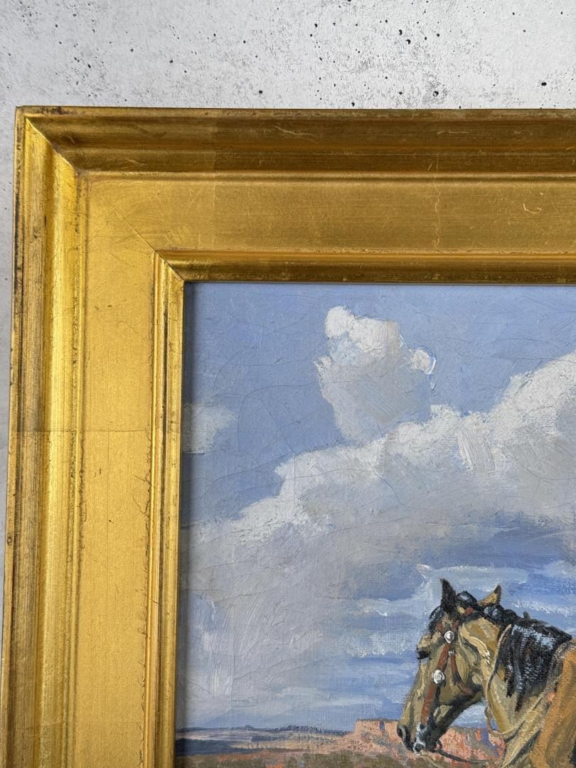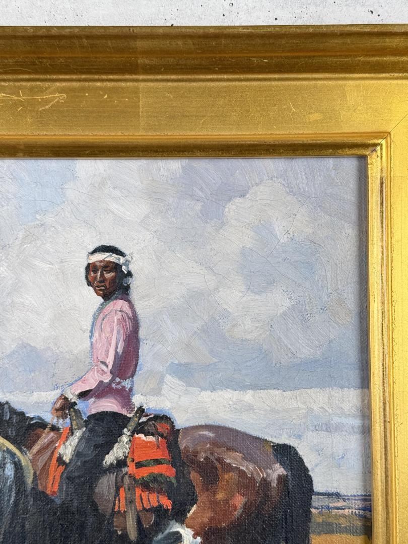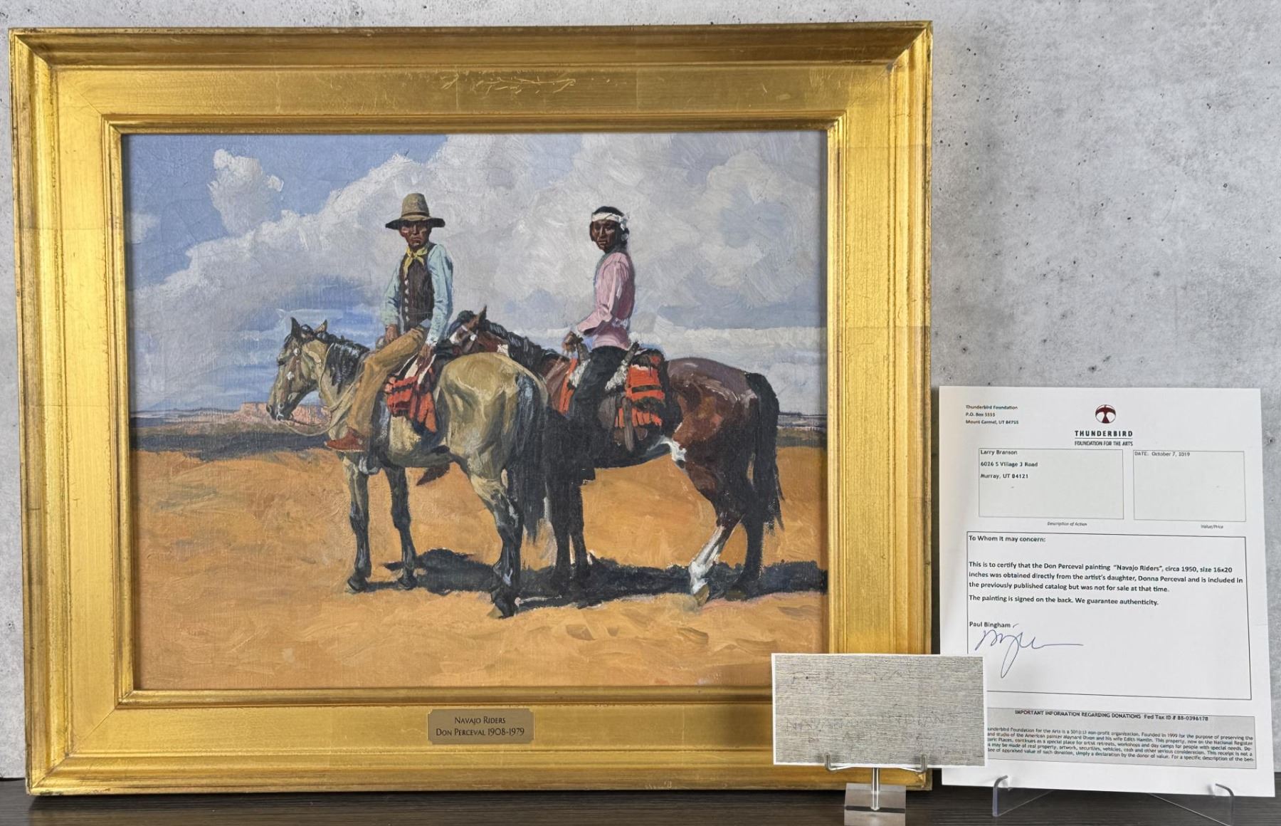 Title is Navajo Riders. 16" by 20" unframed. 21" by 25" framed. Oil on Canvas. Don Louis Perceval (1908 - 1979) was active/lived in California. Don Perceval is known for Western scene and desert landscape painting, illustration. Born in Woodford, Essex, England, Don Perceval became a noted Southwest painter of landscape and its dwellers. His art talent was encouraged by his mother, a recognized painter in England. His family moved to Los Angeles, California where he was raised, and he became fascinated by the early history of the state. He attended the Pasadena Military Academy and Chouinard Art School where he was a student of Nelbert Chouinard and F.T. Chamberlain. By age 19, he was making sketching trips into the desert, and in 1927 was first in Arizona where he became enamored of Hopi and Navajo Indians and their way of life and traditions. He began illustrating books and became an expert in the history of cattle brands and horsemen's equipment. In his late 20s, he returned to England to study at Heatherly Art School and the Royal College of Art. Here he was exposed for the first time to great collections of paintings and was inspired by classic art. He also went to Madrid, Spain for four years, and then returned to the Southwest where he did advertising for the Rio Grande Oil Company. During World War II, he served in the Royal Navy patrolling the Thames Estuary and teaching gunnery, which he did with much acclaim by using cartoons. He then returned to California. At the advice of Millard Sheets, he taught at Chouinard Art School and Pomona College, where he organized the centennial celebration of the school. In 1952, he lived in Arizona with the Hopi Tribe and in Tucson from 1954 to 1959 where he grew to love the paintings of Maynard Dixon. He illustrated numerous children's books including for writers Ann Nolan Clark and Will Hayes. He spent his last years in Santa Barbara.