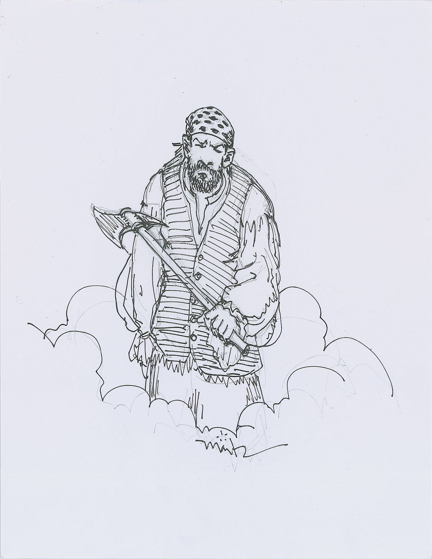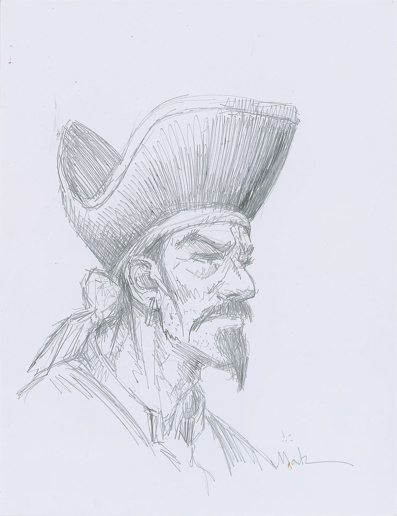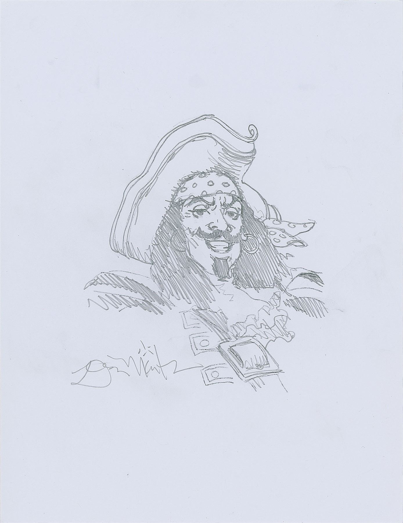 American science fiction, fantasy, and commercial artist (born 1953) who is best known for his creation of the 'Captain' character of the Captain Morgan brand of rum; he has also twice won the Hugo Award for Best Professional Artist, science fiction's highest honor for an artist. Excellent set of three original sketches by Don Maitz on individual white 8.5 x 11 heavy paperstock sheets, each containing a drawing of a classic pirate character, two of which are accomplished in graphite, and one in both graphite and ink; each sketch is signed below, "Maitz." In overall very fine condition.