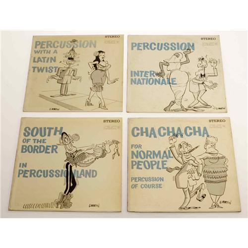 <B>Don Martin Cover Record Album Group of 4 (CMI, circa 1960).</B></I> These four hard to find items, all percussion-heavy dance music by Pierre Du Jardin and the Stereosonic Orchestra, feature wild cover illustrations from MAD man Don Martin. Titles include "Percussion Internationale", "South of the Border in Percussionland", "Cha Cha Cha for Normal People", and "Percussion with a Latin Twist". The records average VG, except "Percussion Internationale" which is GD. The covers all range at VG. The bonus prints listed on the back covers are not included. Cut a rug with these cutting cartoon creations by Martin!