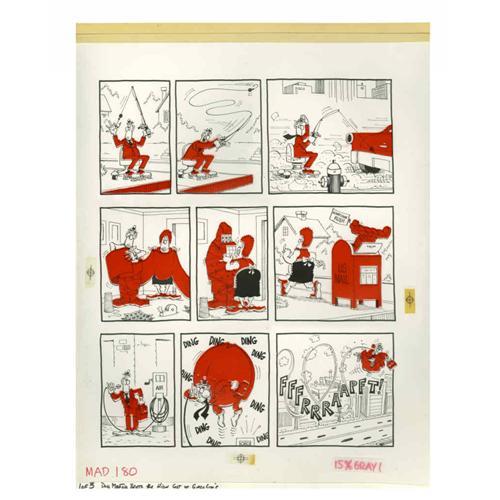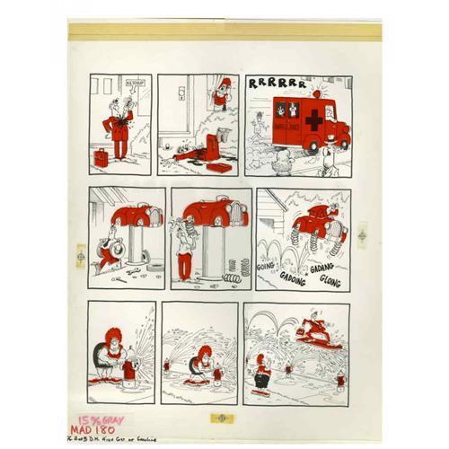 <B>Don Martin - Mad #180 Complete 3-page Story "Don Martin Beats The High Cost Of Gasoline" Original Art (EC, 1976).</B></I> The springboard for these gags is more relevant than ever, and you'll be tempted to try a few of these Don Martin gimmicks for yourself. These pages include the amberlith overlays that indicated where a gray tone was to be dropped into the scenes by the printer. Each page has an image area of 15" x 18.5", and the art is in Excellent condition. <I>From the Mad Magazine Archives</B></I>.