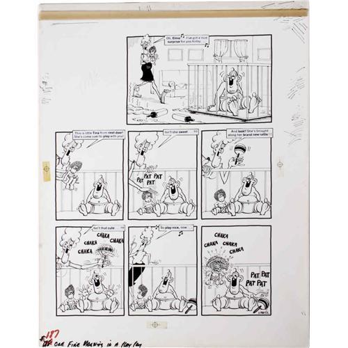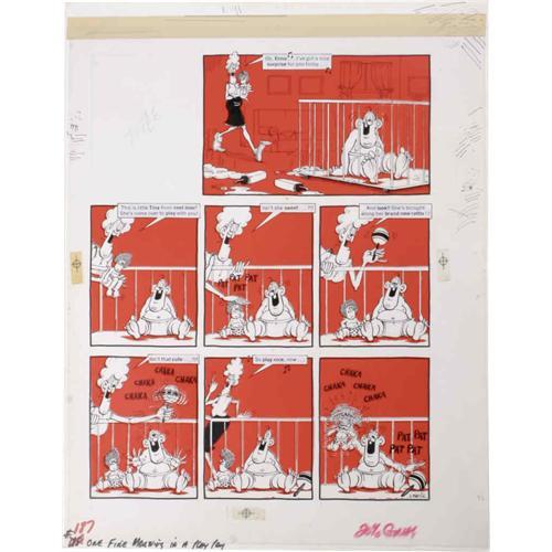 <B>Don Martin - Mad #187 "One Fine Morning in a Playpen" Page Original Art (EC, 1976).</B></I> Baby Elmo gets a wee bit confused as he attempts to play with Little Tina in a "don't try this at home, kiddies" <B>Mad</B></I> moment by Don Martin. Yow! Baby done a bad bad thing! This page features an image size of 15" x 19.5", on a piece of heavy bristol measuring 18.75" x 24". An amber overlay indicates grey tones. The art is missing the first panel's title, which was added during production; otherwise, the piece is in Excellent condition -- unlike poor Little Tina, who was never the same again! <I>From the Mad Magazine Archives</B></I>.