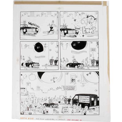 <B>Don Martin - Mad #255 "One Fine Wednesday in Detroit" Panel Page Original Art (EC, 1985).</B></I> Another brilliant idea comes to you courtesy of that <B>Mad</B></I> genius, Don Martin. Where else but here are you gonna find a page with sound effects like "Toomp" and "Fwop?" Hoohah! The image area measures 14.5" x 19.25", on an 18.25" x 22.25" board, with two acetate overlays. The condition of the piece is Excellent. Your condition, should you fail to bid, will be lousy! <I>From the Mad Magazine Archives</B></I>.